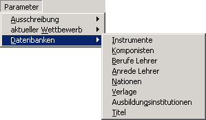 Im Menüpunkt Parameter - Datenbanken sind die Funktionen zur Erfassung und Bearbeitung von Parametern versammelt, die in der Regel nur auf Bundesebene geändert werden können. Eine Ausnahme bilden die Komponisten, Instrumente und Titel der Programmstücke. Sie können auch auf Landes- und Regionalebene bearbeitet werden, sofern sie dort erfasst wurden. Alle anderen Parameter können auf Landes- und Regionalebene nur angezeigt werden. Diese Parameter werden bei der Installation von JMDATEN in den verschiedenen Tabellen zur Verfügung gestellt. Sie dienen in den diversen Erfassungsmasken von JMDATEN zur Anzeige von Auswahllisten.