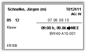 Das Bettenlabel enthält Namen, Vornamen, Teilnehmernummer, Anreisetag, Abreisetag, Datum der Übernachtungen, Wertungskategorie, Uhrzeit, Datum und Ort der Wertung, Wertungsnummer und Kategorien aller weiteren Wertungen des Teilnehmers (links unten). Pro Teilnehmer werden so viele Bettenlabels gedruckt, wie er an Wertungen teil nimmt. |