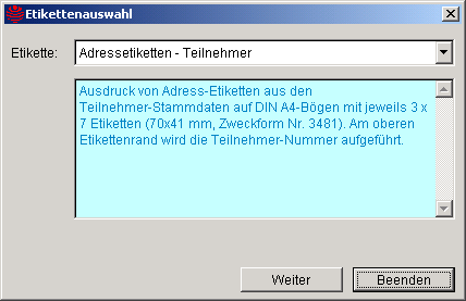 Zum Ausdruck von Adressetiketten der Teilnehmer steht eine Parametermaske zur Verfügung,