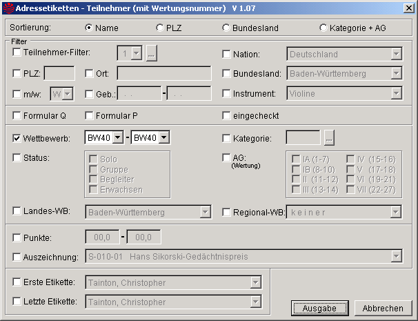 Über ein Markierfeld kann ein Teilnehmer-Filter aktiviert werden, der den Etikettendruck auf eine beliebige Gruppe von Teilnehmern einschränkt.Auch alle Gimmicks, die im Menüpunkt Parameter - aktueller Wettbewerb - Wettbewerbsnummer definiert wurden, können als Ausgabefilter verwendet werden. Gimmicks werden über den Menüpunkt Stamm - Teilnehmer in der Bearbeitungsmaske für Teilnehmer-Stammdaten im Register Karteikarte für jeden Teilnehmer individuell gesetzt. Wenn zu viele Filter eingesetzt werden, kann es ganz schnell passieren, dass keine Daten zur Ausgage gefunden werden.