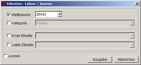 Über die Parametermaske können ein paar wenige Ausgabefilter angegeben werden. Grundsätzlich kann eine Etikette nur für Lehrer gedruckt werden, die im Menüpunkt Stamm - Teilnehmer einem Teilnehmer und somit einer Wertung zugeordnet wurden. Dies gilt auch dann, wenn der Lehrer in der Auswahlliste Erste Etikette bzw. Letzte Etikette angezeigt wird.Über das Markierfeld [X] Juroren kann die Ausgabe auf Juroren eingeschränkt werden. In dem Fall steht der Ausgabefilter Wettbewerb nicht zur Verfügung und die Anwendung des Ausgabedilters Kategorie macht keinen Sinn, da Juroren keiner Kategorie zugeordnet werden können. Um die Organisation der Unterbringung von Teilnehmern zu unterstützen, können Bettenlabels für die einzelnen Teilnehmer,