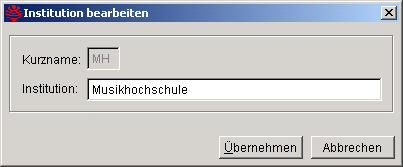 Die Textknöpfe Ändern, Löschen und Neu stehen nur auf Bundesebene zur Verfügung. Anwender von JMDATEN auf Landes- und Regionalebene können also die Kurznamen und Bezeichnungen der Ausbildungsinstitutionen nicht bearbeiten und auch keine neue Ausbildungsinstitutionen erfassen. Bei der Installation von JMDATEN wird die abgefüllte Tabelle mit den Ausbildungsinstitutionen bereitgestellt. Bei Änderungen muss der Bundesmusikrat die modifizierte Tabelle (JMINSTIT.DBF) an die Anwender von JMDATEN auf Landes- und Regionalebene weitergeben.