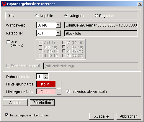 Deutschen Musikrats zu sehen. Über die wenigen Einstellungen in der Parametermaske kann das Aussehen der Seiten jedoch variiert werden.Die Erstellung der HTML-Dateien für die komplette Internet-Veröffentlichung der Ergebnisse erfolgt in drei Hauptschritten. Zunächst muss eine Navigationsseite (Kopfsite) erstellt werden. Als zweiter Schritt muss für jeder Kategorie eine HTML-Seite erstellt werden. In der Auswahlliste Kategorie sind jedoch nur die Kategorien enthalten, für die zum eingestellten Wettbewerb Wertungsergebnisse vorliegen. Als letzter Schritt ist die Seite der Begleiter zu erstellen. Die erstellten HTML-Dateien werden in ein spezielles Verzeichnis abgelegt. Dieses Verzeichnis heisst \INTERNET und wird automatisch beim Aufruf des Menüpunktes Ausgaben - Internet im Datenverzeichnis von JMDATEN angelegt. Über das Register Pfade im Menüpunkt Extras - Optionen wird das Datenverzeichnis angezeigt und kann dort auch verändert werden. Über das Markierfeld [X] Weiterleitungstext wird ein Eingabefeld freigegeben, in dem ein beliebiger Weiterleitungstext editiert werden kann. Dieser Text wird in der Ini-Datei JMDATEN.INI in Parameter Weiterleitungstext hinterlegt und steht somit immer zur Verfügung. Er wird in Abhängigkeit von Bedingungen auf der Ergebnisliste zum Prätikat hinzugefügt. Die Bedingungen sind in der Ini-Datei in den Parametern Mindestpunkte, LW_weiter_ab_AG und RW_weiter_ab_AG festgelegt. Auf Bundesebene steht der Weiterleitungstext nicht zur Verfügung. Begleiter werden grundsätzlich nicht mit Weiterleitungstext versehen. Durch Betätigung des Textknopfes Ausgabe wird die in Option Jederzeit kann über den Textknopf Ansicht jede beliebige bereits erzeugte HTML-Seite mittels Internet-Browser angezeigt werden. Über den Textknopf Bearbeiten kann jede beliebige erzeugte HTML-Seite mit einem einfachen ASCII-Editor nachträglich bearbeitet werden. |
