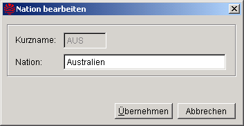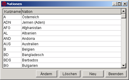 ist das Eingabefeld für den Kurznamen der Nation deaktiviert und kann somit nicht verändert werden. Nur wenn die Bearbeitungsmaske über den Textknopf Neu geöffnet wurde, kann der Kurzname für die Nation erfasst werden.Das Löschen eines Eintrages über den Textknopf Löschen wird abgelehnt, wenn eine Nation bereits einer Anschrift zugeordnet wurde. In der Ablehnung wird die Teilnehmernummer oder Lehrernummer angezeigt, dessen Anschrift diese Nation zugeordnet wurde. Die Ansichtstabelle kann durch Doppelklick auf die Spaltenbeschriftung nach der entsprechenden Spalte sortiert werden. |