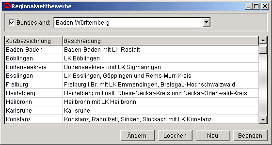 können für die Regionen, die Regionalwettbewerbe veranstalten, Kurzbezeichnung und Beschreibung erfasst und bearbeitet werden.