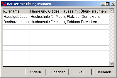 Zum Ändern von Kurzname, Name und Ort eines Übungshauses genügt ein Doppelklick auf den Eintrag oder die Betätigung des Textknopfes Ändern.