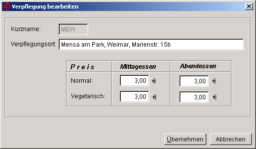 Ändern. Darurch öffnet sich eine Bearbeitungsmaske, in der Anschrift und Verpflegungskosten editiert werden können. Das Eingabefeld für den Kurznamen ist nur editierbar, wenn die Bearbeitungsmaske über den Textknopf