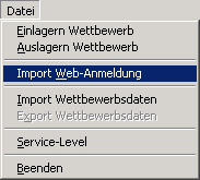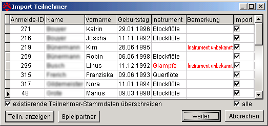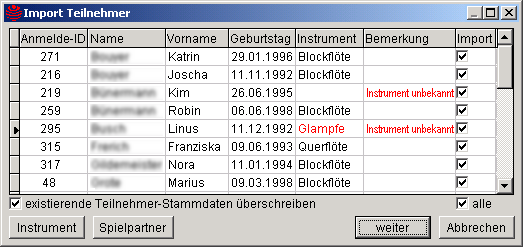 Ausgelöst wird der Import durch Doppelklick auf die gewünschte Datei in der Tabelle der Importmaske mit der linken Maustaste, oder durch die Betätigung des Textknopfes Import, während die gewünschte Importdatei markiert (farblich hinterlegt) ist. Dabei wird die ausgewählte XML-Datei geprüft und zur Weiterverarbeitung in temporäre Tabellen zwischengespeichert (web*.dbf). Ist die XML-Datei nicht für den Import geeignet, wird dies in einer Meldung angezeigt und der Importvorgang abgebrochen. Ansonsten werden in einer weiteren Maske Anmelde-ID, Name, Geburtsdatum und Instrument aller Teilnehmer aufgeführt, die in den Anmeldedaten vorhanden sind.