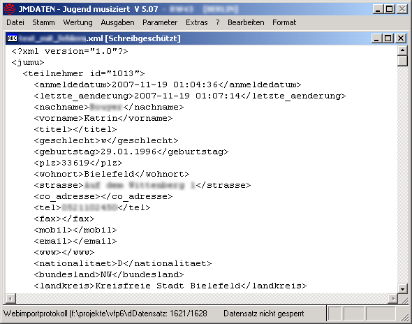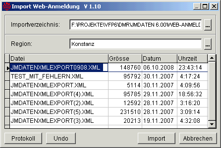 Über eine Maske wird zunächst die XML-Datei ausgesucht, deren Inhalt importiert werden soll. Das Importverzeichnis, das in der Maske angezeigt wird und über den kleinen Textknopf rechts vom Eingabefeld beliebig ausgewählt werden kann, unterscheidet sich vom Importverzeichnis, das über den Menüpunkt In der Tabelle der Maske werden alle Dateien angezeigt, die die Namenserweiterung XML haben. Dies sind evtl. Dateien, die per Download von der Homepage Jugend-musiziert per Download abgeholt wurden und die Anmeldedaten für den Regionalwettbewerb enthalten.