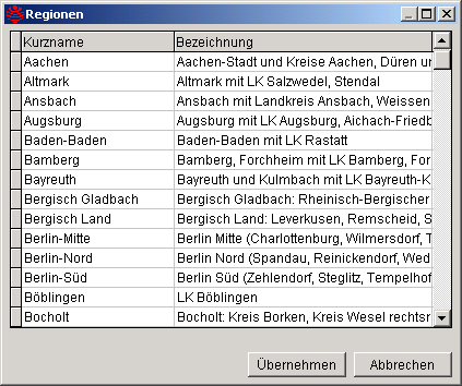 Die Auswahl der Regionen wird angezeigt, wenn der kleine Textknopf (mit den drei Punkten), rechts des Anzeigefeldes mit der linken Maustaste angeklickt wird. Aus der Auswahl ist dann die zutreffende Region auszuwählen. Wenn diese doppelt angeklickt, oder der Textknopf Übernehmen betätigt wird, wird die Region in das Anzeigefeld und zugleich in die INI-Datei eingetragen. Beim nächsten Aufruf der Importmaske wird diese Region automatisch aus der INI-Datei gelesen und angezeigt.