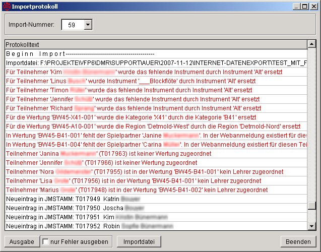 Der Inhalt der Protokolldatei kann in einer separaten Maske angezeigt werden, indem in der Eingangsmaske der Importfunktion der Textknopf Protokoll betätigt wird. Über die Import-Nummer wird der gewünschte Import ausgewählt. Jeder Import einer XML-Datei wird mit einer Import-Nummer versehen. In der Anzeige werden die Hinweise (z.B. Anzahl importierter Teilnehmer) schwarz dargestellt, während Fehler bzw. Korrekturen rot hervorgehoben werden. Die schwarzen Einträge dienen lediglich zur Information. Die roten Einträge sollten besonders beachtet werden. Betroffene Teilnehmerdaten, Wertungen und Programme müssen über die Bearbeitungsmasken von JMDATEN kontrolliert und gegebenenfalls korrigiert werden. Über den Textknopf Ausgabe kann der Protokollinhalt ausgedruckt oder in eine Datei unterschiedlichen Formats abgespeichert werden. Dies betrifft immer nur die Daten des Imports einer XML-Datei. Über das Markierfeld Durch Betätigung des Textknopfes Importdatei wird der Inhalt der XML-Importdatei, die im ASCII-Format vorliegt, in einer Fenster in der Hauptmaske von JMDATEN angezeigt. Diese Anzeige kann nach beliebigen Zeichenfolgen sowohl über die Tastaturkombination STRG-F, als auch über den Menüpunkt