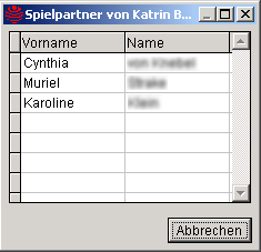 Während der Satzzeiger auf der Anmeldung eines Teilnehmers steht, der an einer Gruppenwertung teilnimmt, wird unterhalb der Teilnehmerliste der Textknopf Spielpartner angezeigt. Beim Betätigen dieses Textknopfes werden in einer kleinen Maske die Namen aller Spielpartner zum aktuellen Teilnehmer angezeigt. Der Textknopf Spielpartner wird nicht angezeigt, wenn der Satzzeiger auf einem Solisten ohne Begleitung steht.Wenn in der Maske Import Teilnehmer mindestens ein Markierfeld Import angekreuzt ist und alle angekreuzten Anmeldungen mit einem im JMDATEN-Stamm bekannten Instrument versehen sind, wird nach Betätigung des Textknopfes weiter eine weitere Maske mit der Übersicht der zu importierenden Wertungen angezeigt.