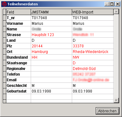 Durch Betätigung dieses Textknopfes werden in einer zusätzlichen Maske die Daten des Teilnehmers in zwei Spalten angezeigt, zum Einen die Daten aus dem Stamm von JMDATEN (Spalte JMSTAMM) und zum Anderen die Daten aus der Importdatei (Spalte WEB-Import). Unterschiede zwischen existierenden und zu importierenden Teilnehmerdaten werden in roter Schriftfarbe hervorgehoben.