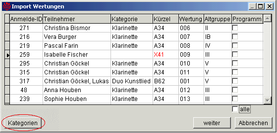 Die Importfunktion überprüft die Kurzbezeichnungen der Kategorie. Wenn die Kurzbezeichnung im Stamm von JMDATEN nicht existiert, wird das Kürzel in der Maske rot dargestellt. Ausserdem ist dann in Spalte Kategorie keine Bezeichnung eingetragen. Wenn der Satzzeiger auf einer Wertung mit ungültiger Kategorie steht, wird unterhalb der Tabelle der Textknopf Kategorien angezeigt.