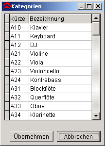 Über diesen Textknopf (mit der linken Maustaste anklicken) wird in einer kleinen Maske eine Auswahl der gültigen Kategorien geöffnet. Alternativ kann auch das rot dargestellte Kürzel mit der linken Maustaste doppelt angeklickt werden. In der kleinen Maske muss die gewünschte Kategorie ausgesucht und übernommen werden. Das erfolgt durch Betätigung des Textknopfes Übernehmen oder durch Doppelklick auf die gewünschte Kategorie.In de Spalte Teilnehmer werden neben dem Namen des Teilnehmers, von dem die Anmeldung stammt, auch die Namen der Spielpartner bzw. Begleiter angezeigt. Über die Markierfelder in Spalte Programm kann für jede Anmeldung angegeben werden, ob das zugehörige Wertungsprogramm ebenfalls importiert werden soll. Per Default ist der Import der Wertungsprogramme deaktiviert. Wenn in der Spalte Kürzel keine roten Einträge vorhanden sind, also alle Kategorien gültig sind, kann der Import über den Textknopf weiter vervollständigt werden. In einer Protokolldatei werden alle Vorgänge des Imports festgehalten.